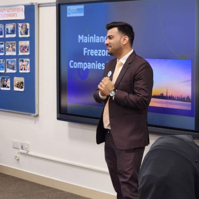The session provided students with practical insights into UAE licensing structures, corporate tax, and VAT, helping them understand how financial and regulatory frameworks shape business success in the region.